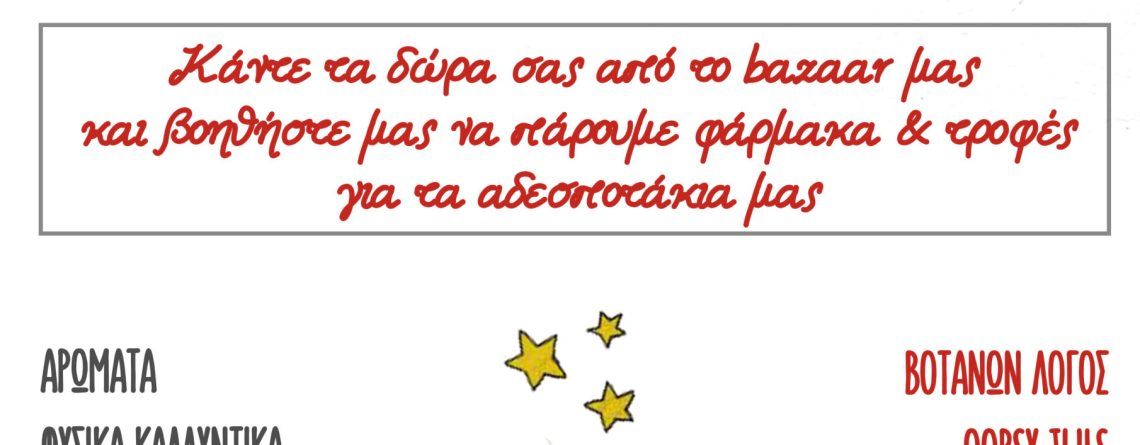 Κάντε τα δώρα σας από το Χριστουγεννιάτικο Φιλοζωικό Bazaar μας και βοηθήστε μας να προσφέρουμε στα αδεσποτάκια μας τροφή και φάρμακα! Ότι σας περισσεύει από τροφή, παιχνίδια, κουβερτούλες, σπιτάκια κ.α. , εμάς μας είναι ότι πιο πολύτιμο για να φροντίσουμε τα πλασματάκια αυτά! Ελάτε να γνωρίσετε από κοντά τα σκυλάκια και τα...